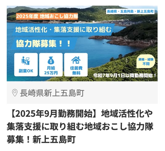 ・【2025年9月勤務開始】地域活性化や集落支援に取り組む地域おこし協力隊募集!新上五島町(興味ある数:98件)