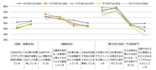 性別に年代を掛け合わせました。男性30代は「7.プライベート」重視や「8.仕事は収入を得る手段」の割合が他の年代や女性に比べて高くないにもかかわらず、〈貢献志向〉が低めで「9.やる気が下がった」割合が高いという特徴があります。男性20~30代には「10.割り当てられた業務以上のことはなるべくやらない」傾向が比較的見られます。男性20代の結果からは「3.会社やチーム」「4.顧客や取引先・仕事相手」への貢献よりも自身の「1.キャリアアップや成長」を重視していることもうかがえます。