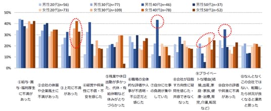 ・ 女性40~50代は、「1.評価や報酬が見合わない」「3.昇給・昇進が期待できない」「4.問題が改善されない」「6.上司に不満」を挙げる割合が高い。