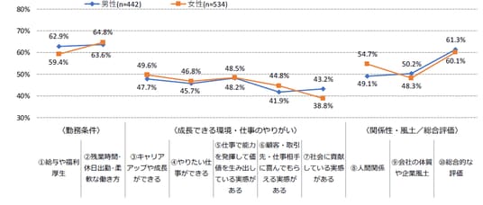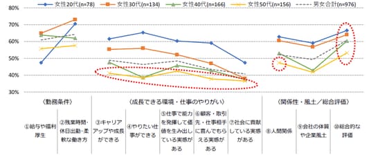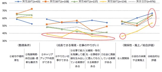 ・ 男女50代では、〈成長できる環境・仕事のやりがい〉のほか、「8.人間関係」「9.会社の体質や企業風土」の評価も低い。特に男性50代の「8.人間関係」は30%台にとどまる。