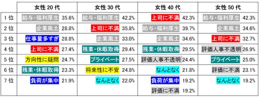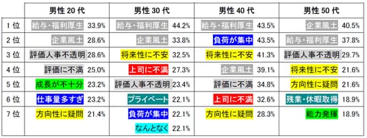 ・ 「1.給与・賞与・福利厚生」「2.会社の体質や企業風土」はほとんどの性年代で3位以内に挙がる。次いで「6.評価や人事が不透明」や「10.自分の評価に不満」が男性各年代と女性40~50代でランクイン。
