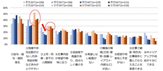 ・ 女性30代の「2.残業や休日出勤が少ない、休みがとりやすい」が突出している。「1.給与・賞与・福利厚生」「3.上司・同僚・部下の人間関係」なども高い。女性40代もそれに準じる。