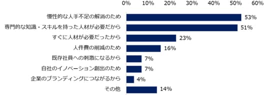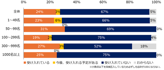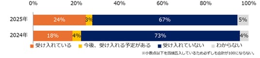 - 24%が副業・兼業で働く人を受け入れていると回答。前年より6ポイント上昇。受け入れている理由は「人手不足解消」「専門人材の獲得」。