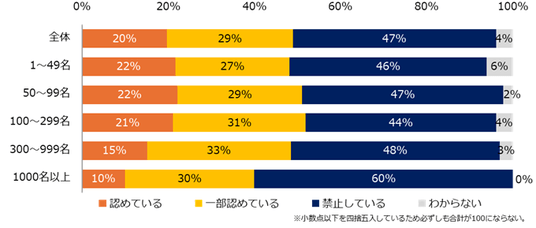 1:49%と、約半数の企業が社員の副業・兼業を認めていると回答。前年調査より4ポイント上昇。(図1~3)「現在、社員の副業・兼業を認めていますか?」と伺うと、約半数の49%が「認めている」(認めている:20%、一部認めている:29%)と回答。2024年に実施した同調査(※)より、3ポイント上昇しました。
