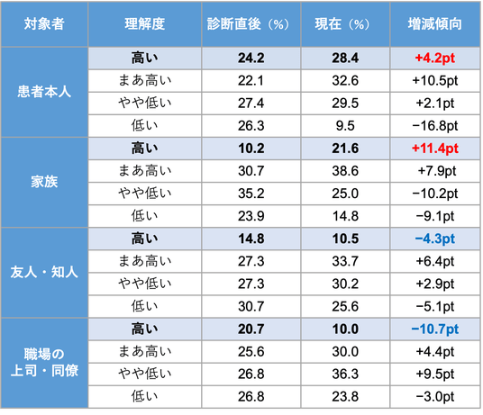 「理解度が高い」との回答は患者本人と家族においては診断直後よりも現在の方が上昇している一方で、友人では14.8%から10.5%、上司・同僚では20.7%から10.0%と低下している。