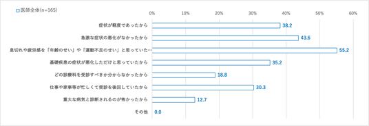 医師調査では、51%が患者の受診遅延傾向を認識していることが明らかとなりました。背景には「症状を他の病気や年齢によるものと思い込んでしまう」ことなどが挙げられており、早期診断の妨げになっていることが示唆されました。