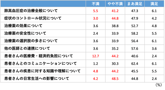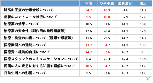 患者への質問:肺高血圧症の診療や日常生活への影響についての満足度を教えてください。