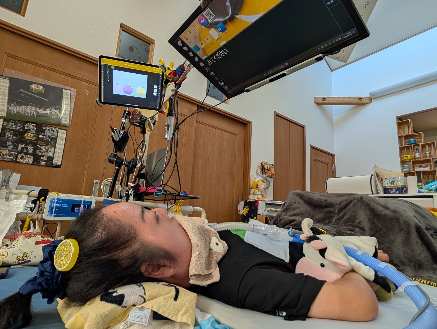 四肢を自由に動かすことはできませんが、田中さんは視線入力による会話補助装置でのコミュニケーションはもちろん、野球観戦、オンラインスポーツ、絵画や楽器演奏、おしゃれ、旅行など何でもやってみたいことにチャレンジしています。