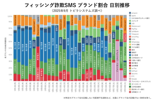 実在する企業やブランドをかたるSMSについて、2025年9月は「三井住友カード」「Mastercard」などのクレジットカード会社をかたるSMSの発生が目立ちました。9月下旬には「アメリカン・エキスプレス」や「PayPay」をかたるSMSが局所的に急増しました。