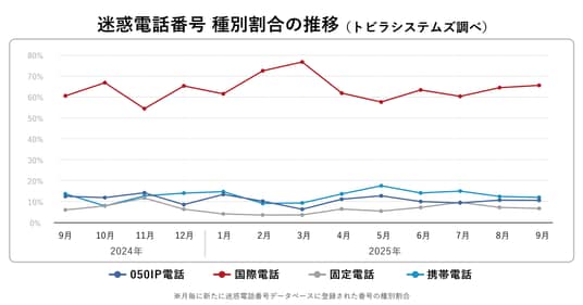 ○迷惑電話番号の割合は国際電話が高水準で推移続く2025年9月に新たにトビラシステムズの迷惑電話番号データベースに登録された番号の種別割合は、国際電話番号が65.6%(前月比+1.1%)となりました。