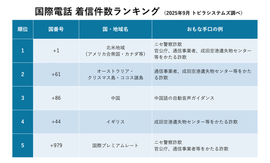 トビラシステムズの調査で、2025年9月も引き続き、北米地域(+1)の番号を中心に、ニセ警察詐欺の電話が確認されました。また、様々な国番号を使い、「あなたの名前が記載された遺失物が届いている」といった自動音声が流れる成田空港国際警察署遺失物センターをかたる電話が多数確認されています。その他、総務省や入国管理局などの官公庁、通信事業者などをかたる電話も発生が見られています。