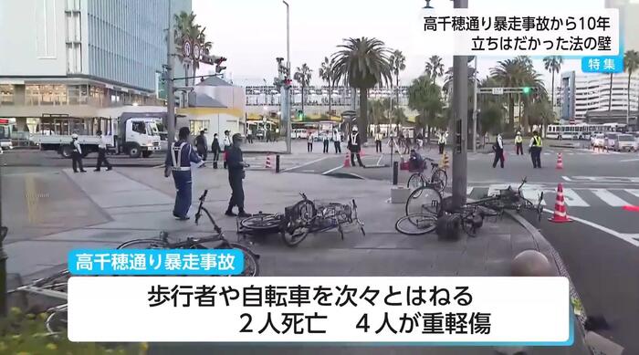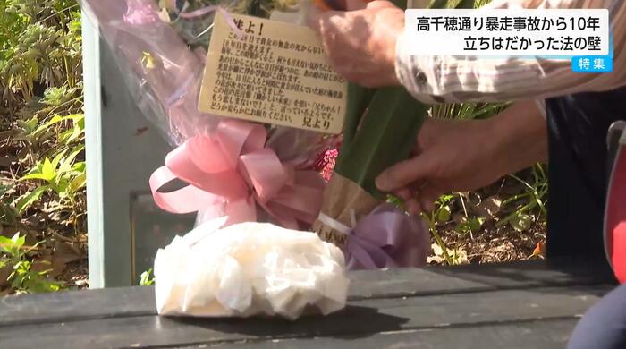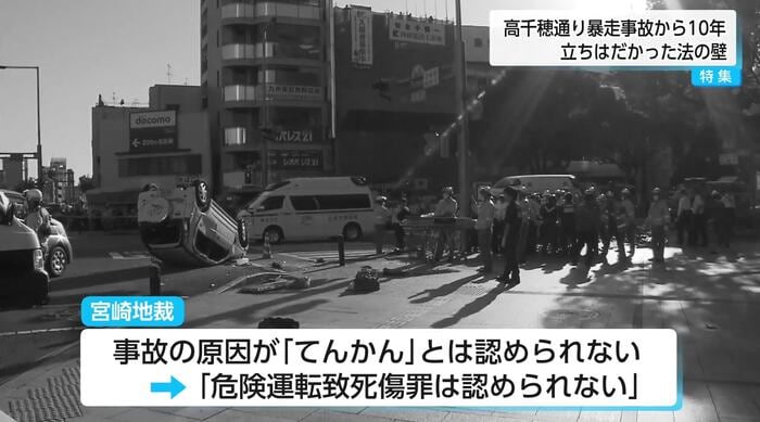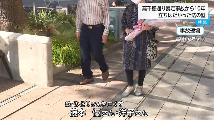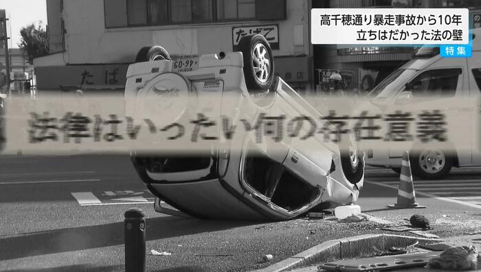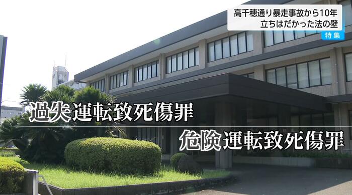 中心市街地の歩道を車が暴走した宮崎市高千穂通りの事故から10年が経過した。この事故では2人が死亡、4人が重軽傷を負った。加害者の裁判では「故意」か「過失」かが争点になり、遺族はより罪が重い「危険運転致死傷罪」の適用を求めたが、「法の壁」に阻まれた。事故から10年、遺族は今もなお苦悩を続けている。