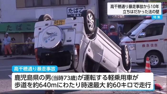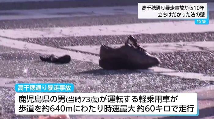 午後2時50分ごろ、宮崎市の中心部にある高千穂通りで、悲劇は突然発生した。鹿児島県の当時73歳の男が運転する軽乗用車が、歩道をおよそ640メートルにわたり、時速最大約60キロで走行。歩行者や自転車を次々とはねた。