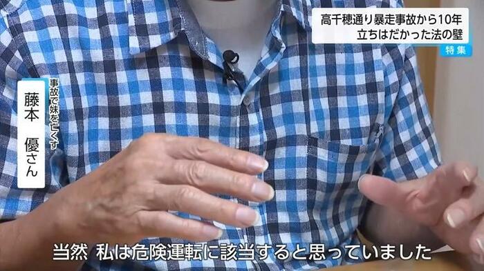 優さんは、「妹はちゃんとルールを守って、歩道を歩いていて、信号待ちをしてたでしょ。車が後ろから来るなんて思いもしないじゃないですか」と話し、「危険運転致傷罪」が適用されなかったことに、強い疑問を呈している。