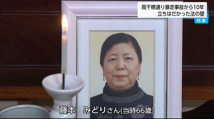 この事故により、藤本みどりさん(当時66歳)を含む2人が尊い命を落としたほか、4人が重軽傷を負った。藤本さんはこの日、旅行のチケットを受け取りに行った帰りに、悲劇に巻き込まれた。