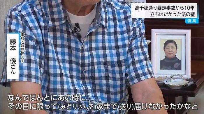 藤本さんは、「もし、天が一言だけ、一つだけ願いごとを聞いてやると言ったら、事故に遭う1時間前にタイムスリップして、ちゃんと(みどりさんを家まで送り)届けて…」と、悔やんでも悔やみきれない思いを話した。