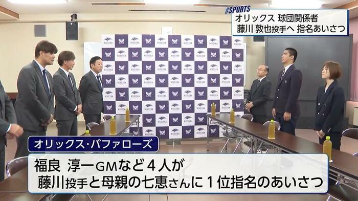 延岡学園高校を訪れたのは、福良淳一ゼネラルマネージャーを含む4人。藤川投手と母・七恵さんに対し、1位指名のあいさつをした。