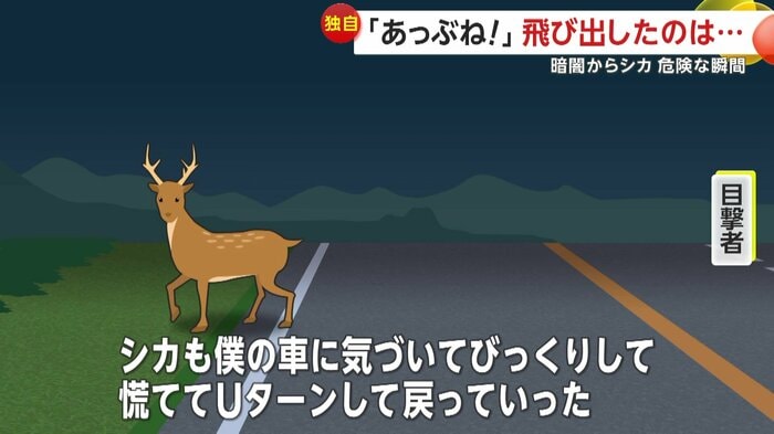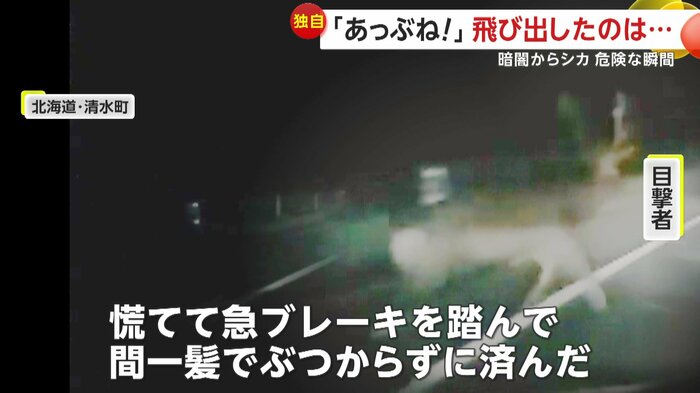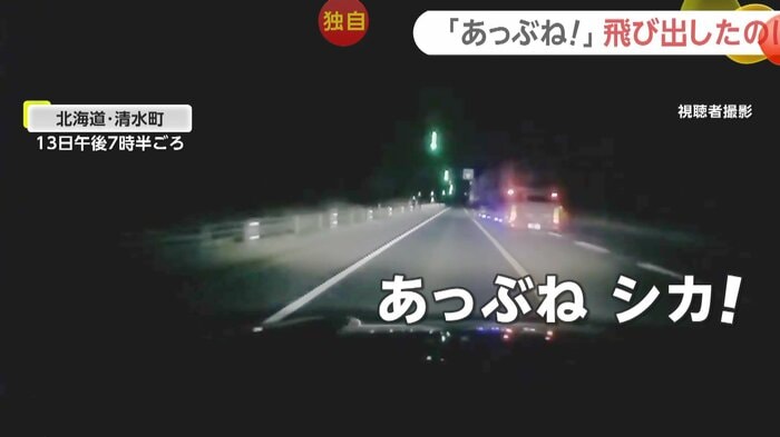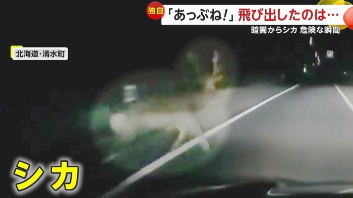 北海道・清水町で13日午後7時半頃、車に走行中の男性が思わず「うわ!…あっぶね、シカ!」と声をあげた。