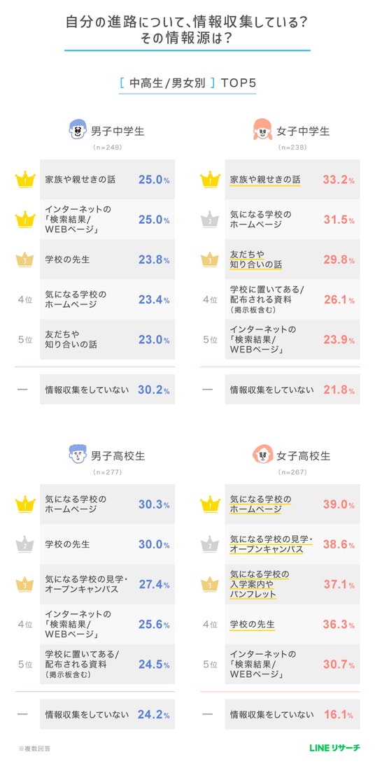 中高生に、自分の進路について情報収集をしているか聞きました。また、しているという人にはその情報源について聞いてみました。