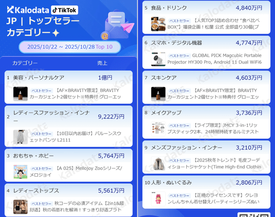 『Kalodata』は中国の高帆破浪科技(浙江)有限責任公司が提供するTikTok Shop分析ツールで、当社は今年8月より日本国内での正規代理店として提供を開始しました。本レポートでは、バズった動画や商品カテゴリの動向など幅広く紹介し、最新の消費トレンドをお伝えします。
