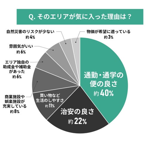 通勤・通学の便の良さが圧倒的に重視されており、全体の約40%を占めています。次に治安の良さが約22%と続き、この2つの理由で全体の約62%を占めています。生活の基盤となる要素が重視されていることがわかります。