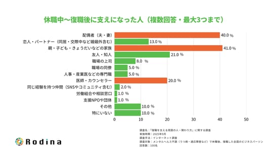 復職者が支えになった存在(複数回答)として、特に多かったのは以下の通りです。- 配偶者(夫・妻):40%