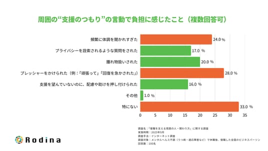 周囲からの“支援のつもり”の言動で負担に感じたこととしては以下が挙げられました。- プレッシャーをかけられた(例:「頑張って」「回復を急かされた」):28%