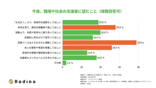 ・今後望む支援は 「回復ペースは人それぞれと理解してほしい」(39%)、「適切な距離感を保ってほしい」(28%)など “尊重と距離感”を求める声が多い