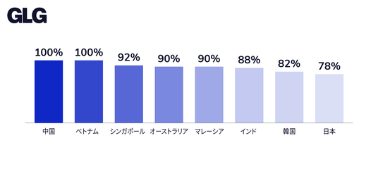 国別にみると、中国とベトナムでは、回答者のすべてが「不安定な貿易・関税政策」を選択した一方、日本の回答者のうち、「不安定な貿易・関税政策」を選択した人の割合は78%にとどまりました。
