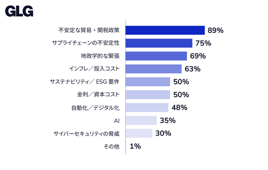 ビジネスに直接的な影響を与えている要因について伺ったところ、89%が「不安定な貿易・関税政策」と回答。マクロトレンド(インフレ)や、メガトレンド(ESG、自動化、AIなど)を上回り、関税政策がビジネスにもっとも影響を与える要因となっていることが分かりました。