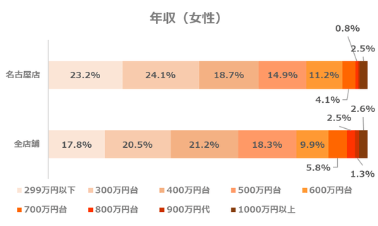 名古屋店では、全店舗と同様に年収500万円台が、最も多い層となっています。