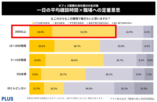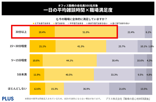 30分以上雑談している人は、そうでない人に比べて「今の職場に満足している」と答える割合が高い傾向が明らかに。