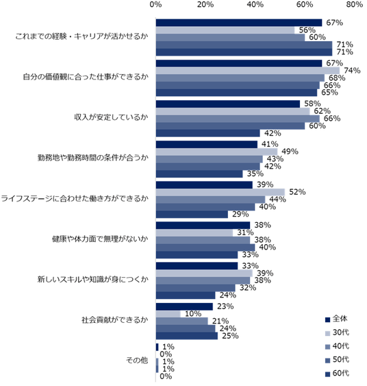 セカンドキャリアを選択する上で重視することを伺うと、トップは「これまでの経験・キャリアが活かせるか」「自分の価値観に合った仕事ができるか」(同率67%)でした。
