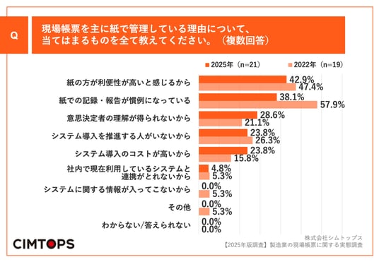現場から挙がる理由をみると、「紙の方が利便性が高い」「紙での記録・報告が慣例になっている」といった声が中心でした。