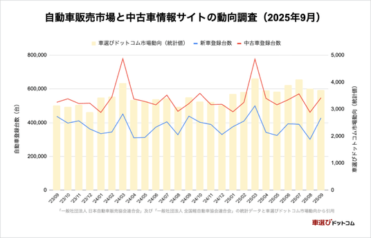 株式会社ファブリカホールディングスの完全子会社、株式会社ファブリカコミュニケーションズ(本社所在地:愛知県名古屋市中区、代表取締役社長CEO:谷口 政人)が運営する中古車情報サイト「車選びドットコム」は、2025年9月の新車・中古車登録台数の推移および当サイトの販売台数推移をもとに中古車市場の動きをまとめた『中古車市場統計レポート』をご案内いたします。
