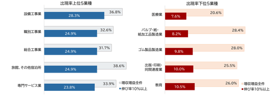 伸び率10%以上の出現率の上位5業種を業種51分類(※TDB景気動向調査の業種区分に準ずる)別にみると、1位は「設備工事業」で28.3%、2位は「職別工事業」、「総合工事業」がともに24.9%で続いた。建設関連業種が上位を占めた背景には、民間の設備投資の活発化や土木工事の堅調な推移がある。また、同率2位にはインバウンド需要やポストコロナでの外出機会の増加を背景に「旅館、その他宿泊所」も24.9%で並んだ。5位には設計事務所をはじめとした土木建築サービス業や経営コンサルタントなどの「専門サービス業」が23.8%で続いた。一方で、下位5業種を見ると、最下位は「医療業」7.6%、次いで「パルプ・紙・紙加工品製造業」8.2%、「ゴム製品製造業」9.8%、「出版・印刷・同関連産業」10.0%、「教育」10.5%と続いた。