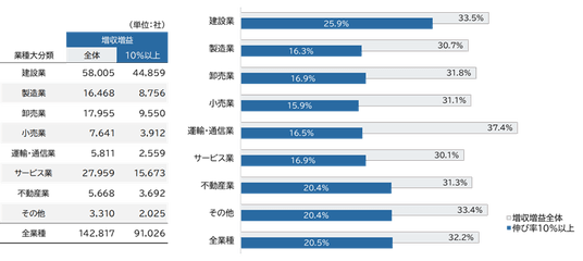 増収増益企業を業種大分類別でみると、「建設業」が5万8,005社と最も多く、伸び率10%以上企業は4万4,859社であった。災害復旧工事や半導体工場などの大規模開発、大都市圏での再開発などの好材料が業績を押し上げた。次点は「サービス業」で2万7,959社(伸び率10%以上企業1万5,673社)、「卸売業」が1万7,955社(伸び率10%以上企業9,550社)となった。