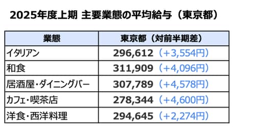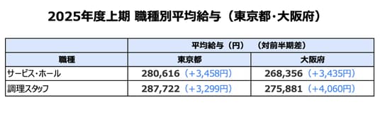 2025年度上期における飲食業界の平均月給について、東京都は301,309円で2024年度下期から3,874円上昇(前半期比101.3%)、大阪府は288,499円で同比+2,836円(前半期比101.0%)。また、愛知県は275,643円で同比+1,726円(前半期比100.6%)、福岡県は同比+4,338円で、267,748円(前半期比101.6%)という結果になりました。