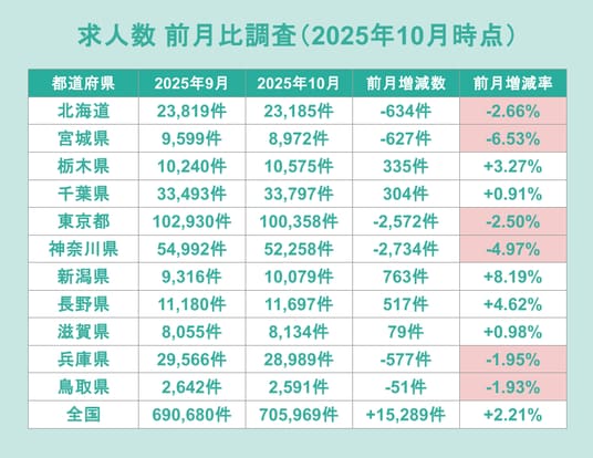 募集時給は全国平均で過去最大の伸びを記録し、最低賃金の引き上げが行われた自治体では鳥取県をはじめとして3%を超える上昇率も示しました。一方で、宮城県では求人数が減少するなど、企業側の採用姿勢に影響も出ています。