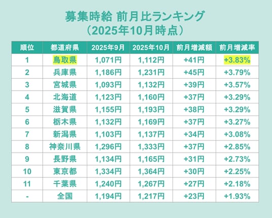 まず、2025年10月時点の募集時給が前月比でどのくらい上昇したか分析します。上昇率を都道府県別にランキングで見てみると、調査時点で最大となる73円の引き上げを施行した鳥取県が+3.83%で1位となりました。次いで兵庫県が+3.79%、宮城県が+3.57%と続いています。募集時給の水準がもともと高い東京都などの首都圏は、下位のランクインとなりました。