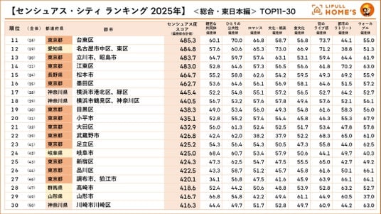 LIFULL HOME'S総研 「センシュアス・シティランキング2025年 総合・東日本編」TOP11~30