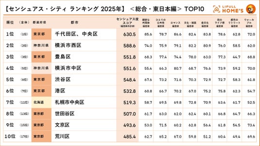 LIFULL HOME'S総研 「センシュアス・シティランキング2025年 総合・東日本編」TOP10