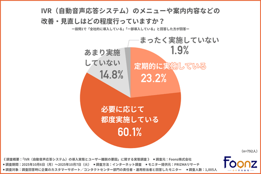 「IVRのメニューや案内内容などの改善・見直しをどの程度行っているか」について尋ねたところ、『必要に応じて都度実施している(60.1%)』が最も多く、『定期的に実施している(23.2%)』と続きました。