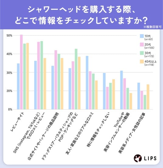 シャワーヘッドの購入時に情報をチェックする場所として最も多かったのは「レビューサイト」で、全体の44.2%を占めました。次に多かったのは「SNS(Instagram、TikTokなど)での口コミ・レビュー」で41.4%。さらに「ドラッグストア・バラエティショップのPOP・ランキングなど」が35.9%、「友人・家族などのリアルな口コミ」が24.9%と続きました。ユーザーはオンラインとオフラインの両方で、商品に関するリアルな情報を求めているようです。