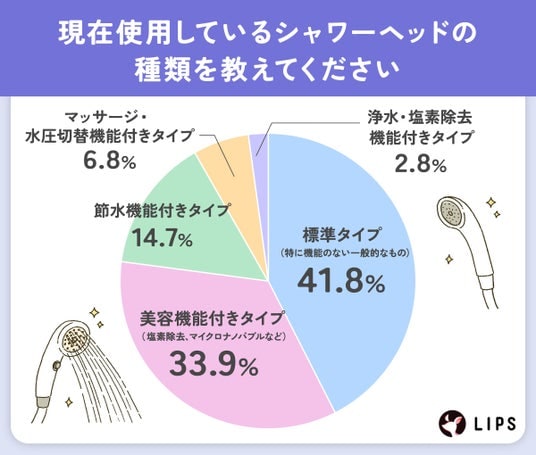 使用しているシャワーヘッドは「標準タイプ」が主流、「美容機能付き」も3割以上