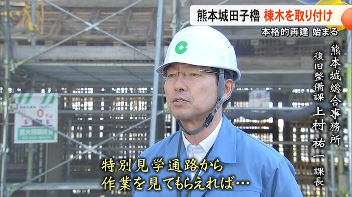 熊本城総合事務所・復旧整備課の上村祐一課長は「素屋根がありますけど、ネットも薄いものにしてあって、復旧作業をご覧いただけると思いますので、ぜひ特別見学通路から作業をご覧いただけたら」と話した。