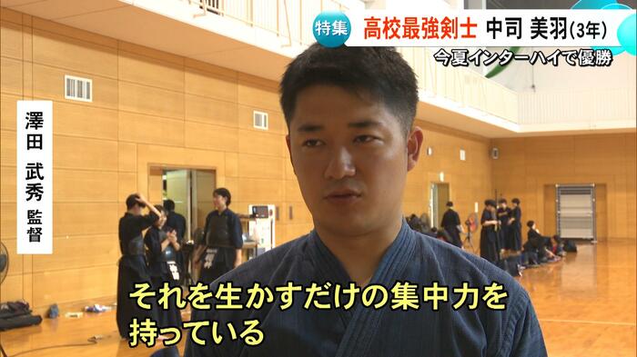 中司選手の強さはどこにあるのか、3年間指導してきた澤田武秀監督は「技の切れとスピードは特に人と違う秀でたものがあると思う。体が出るスピード、間合いを埋めるスピード、瞬間的な速さというのが人よりも長けている。それを生かすだけの集中力を持っている生徒」と話す。
