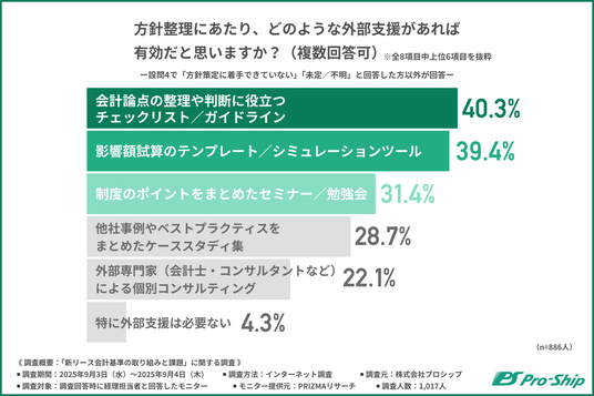 「方針整理にあたり、どのような外部支援があれば有効だと思いますか?」と尋ねたところ、『会計論点の整理や判断に役立つチェックリスト/ガイドライン(40.3%)』が最も多く、『影響額試算のテンプレート/シミュレーションツール(39.4%)』『制度のポイントをまとめたセミナー/勉強会(31.4%)』と続きました。