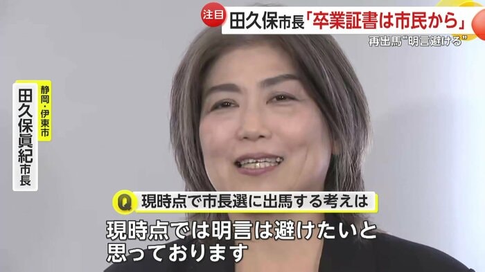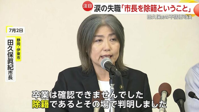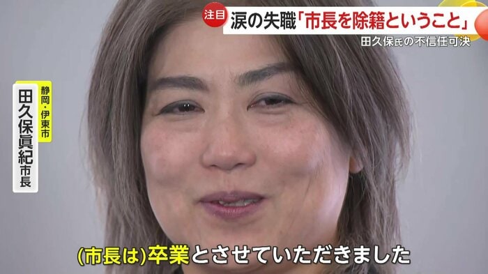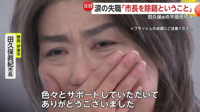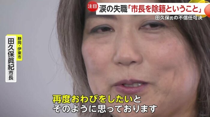 自身の学歴詐称問題に端を発し大きな騒動となっていた静岡・伊東市の田久保眞紀市長だが、伊東市議会は10月31日、田久保市長に対する二度目の不信任決議案を可決し、失職が決まった。議会の閉会後、田久保市長は取材に応じ、一連の騒動について謝罪し、市民から寄せられたという応援の声に涙ながらに感謝を伝えた。一方で、失職に伴う市長選については、「支援者と話し合う」と明言を避けた。
