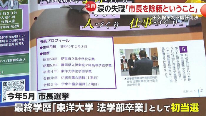 2025年5月の市長選挙で、自身の最終学歴を「東洋大学 法学部卒業」として初当選した田久保市長。